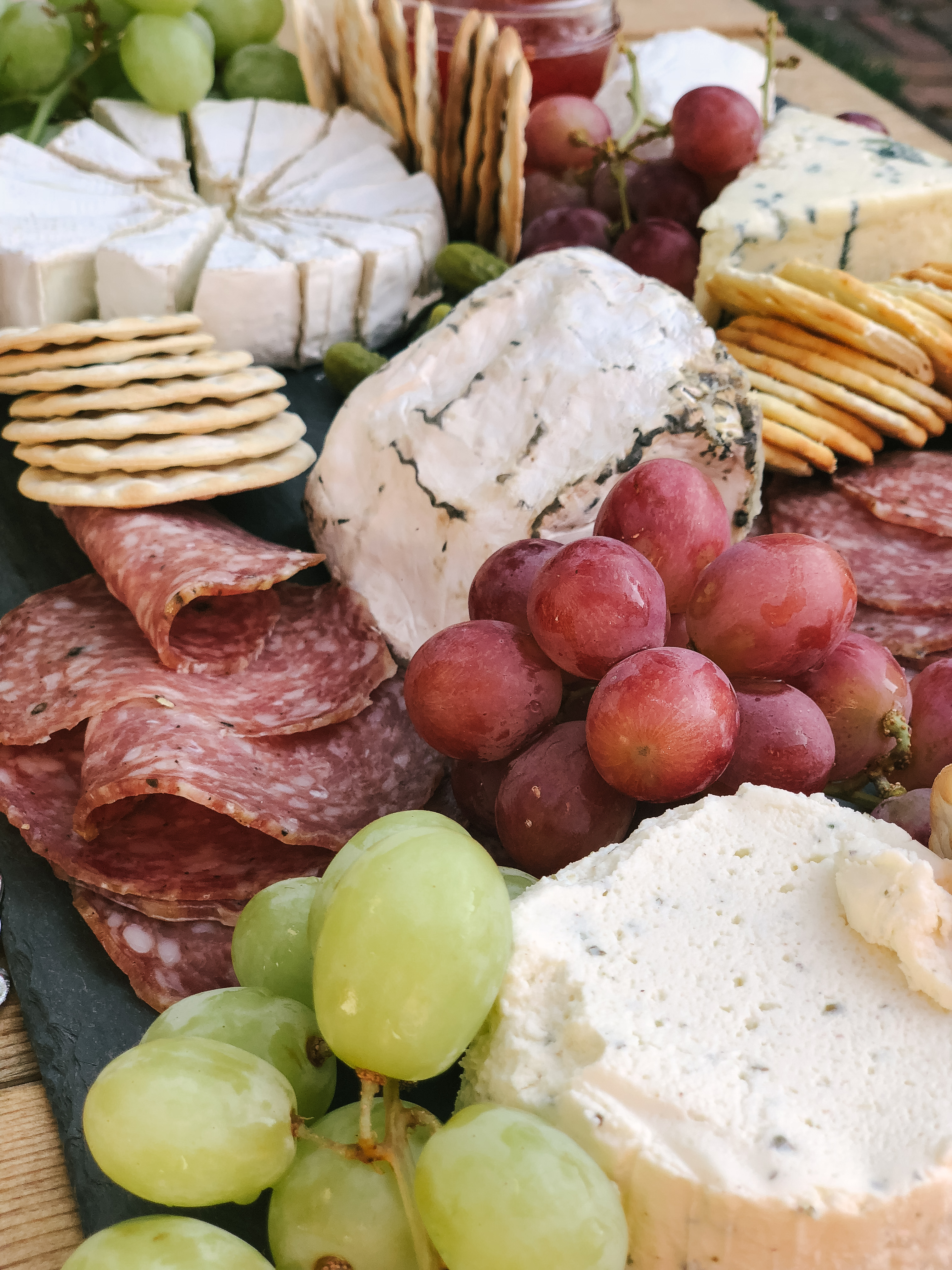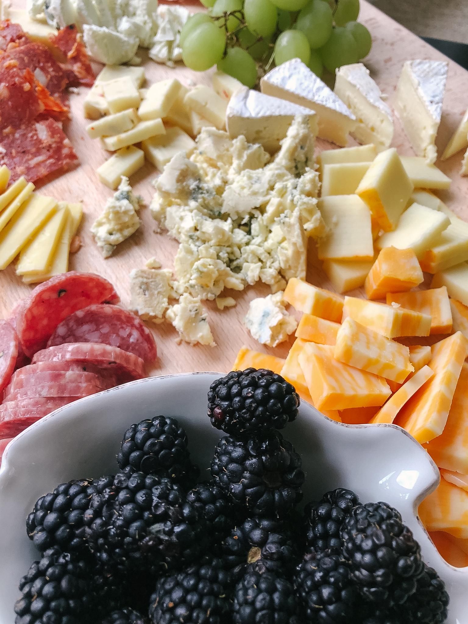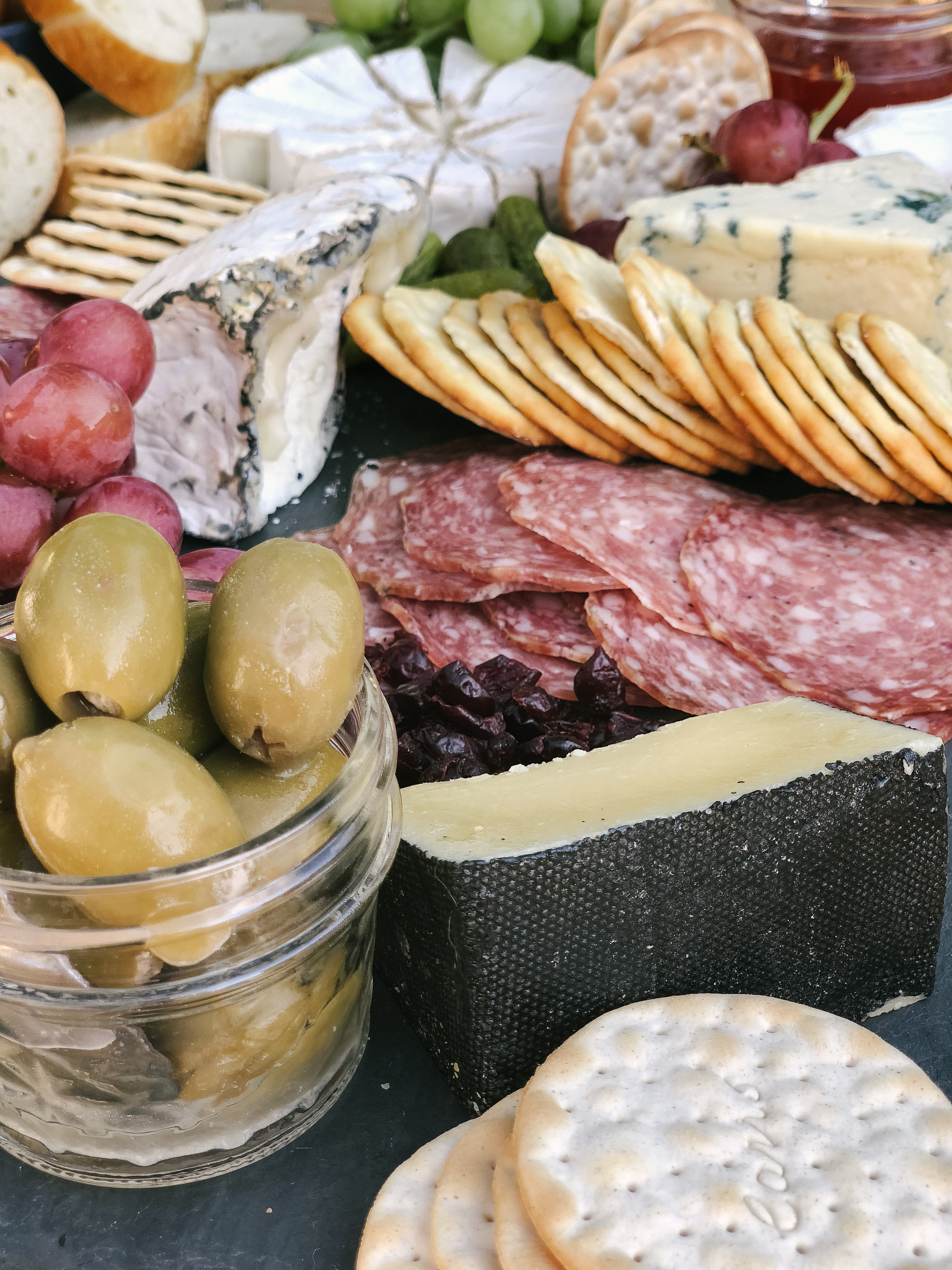 If you’ve got grapes, throw them on the board! Raspberries or blackberries are also awesome flavors to pair with sharp, savory cheeses on a board. Nuts of any kind are great for boards, as well as salty olives. I don’t care for olives myself, but they’ve always been a hit when I incorporate them for guests and Ryan.