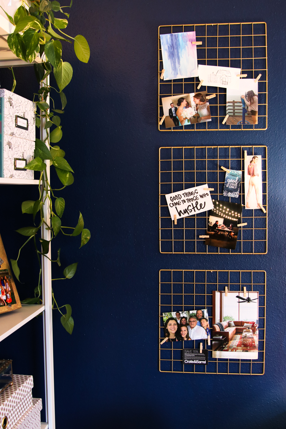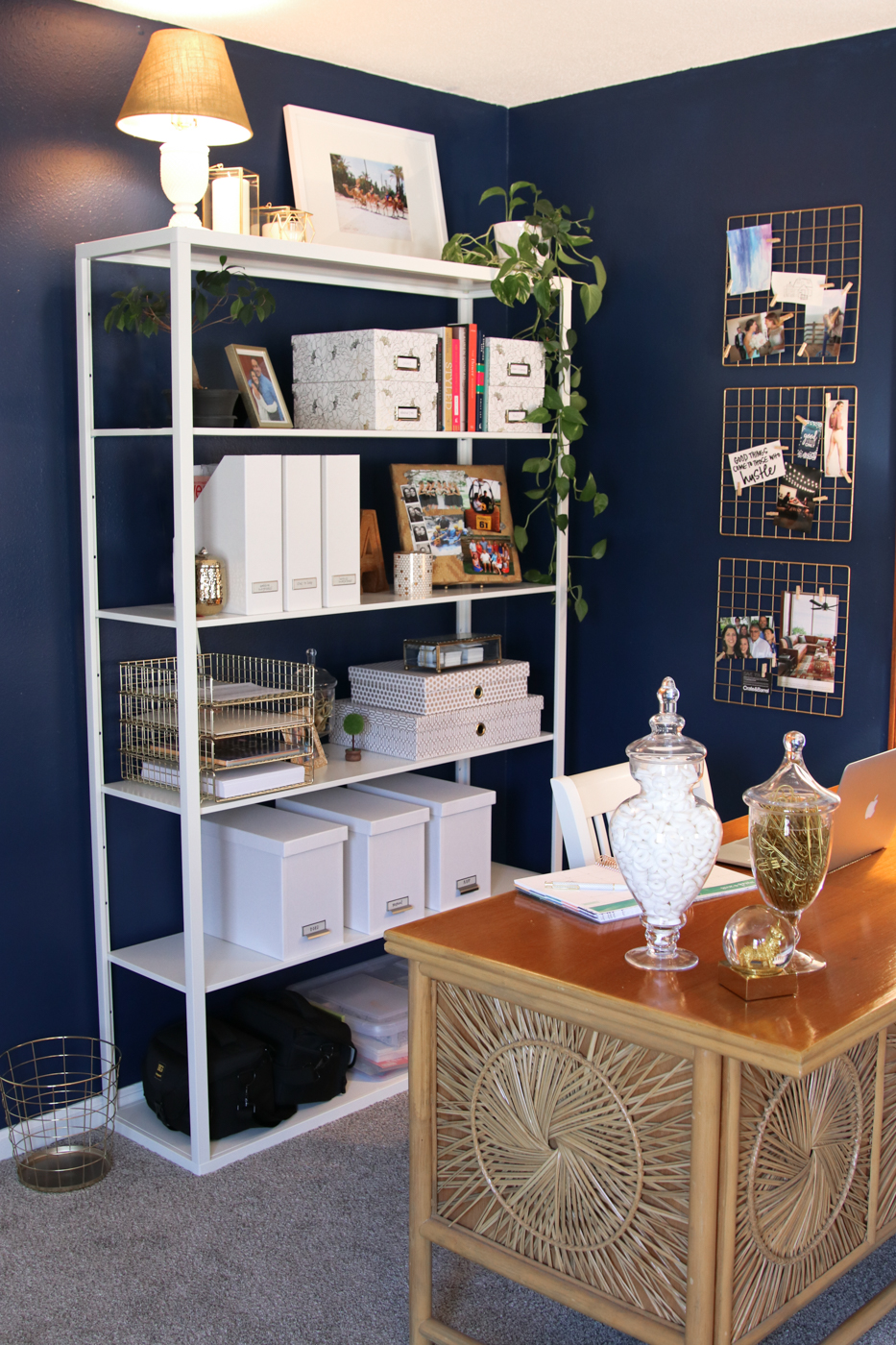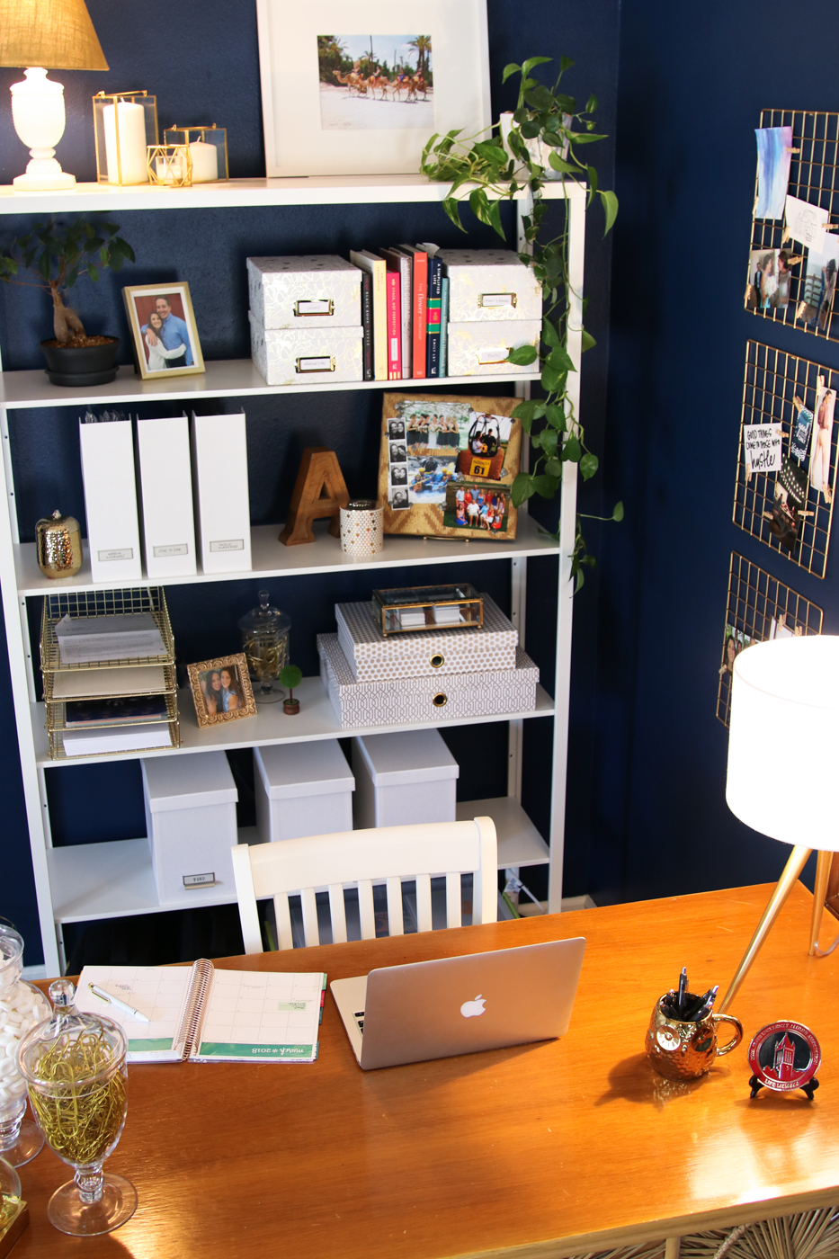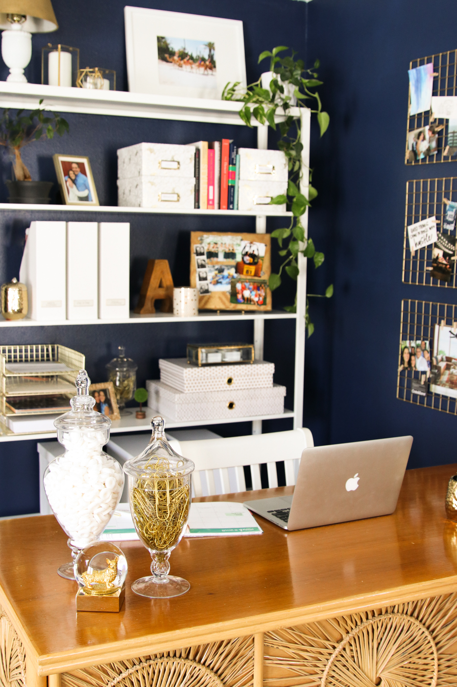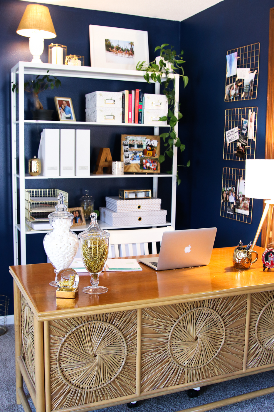 I was also really cheap about some parts of this office. Instead of just buying the gold wall grids from Target, I bought these $3 grid cubby panels online and spray painted them gold. I also pulled an antique lamp from my basement and spray painted its (non-antique) shade gold. Instead of buying vase fillers, which I secretly hate, I filled my containers with items I’ll use—like a million Life Savers mints and tons of gold paper clips from Hobby Lobby’s clearance section.