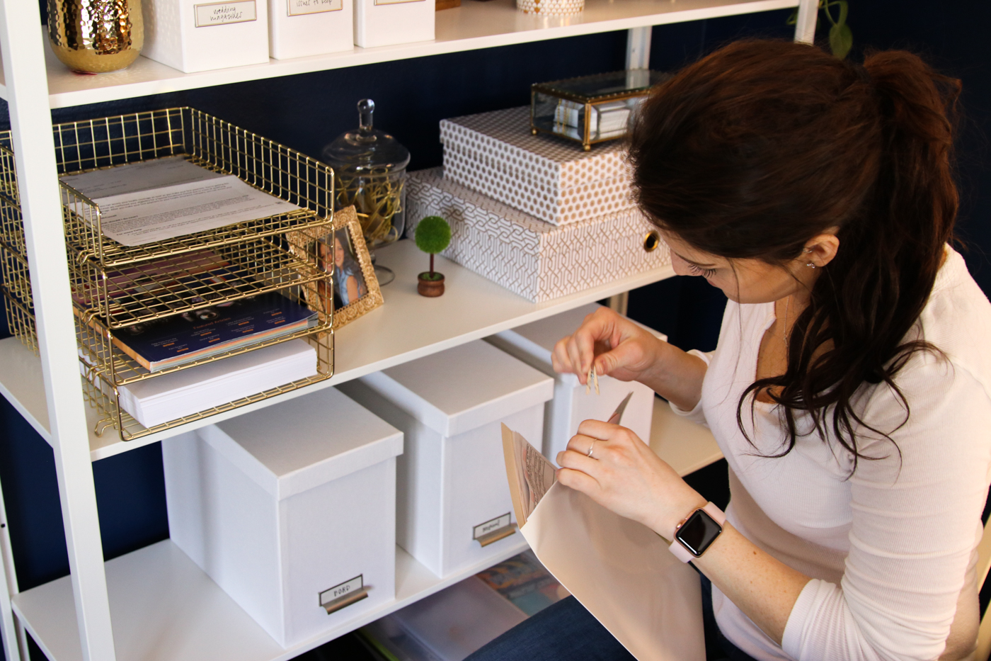 - 2 pretty gold and white office storage boxes from the Container Store