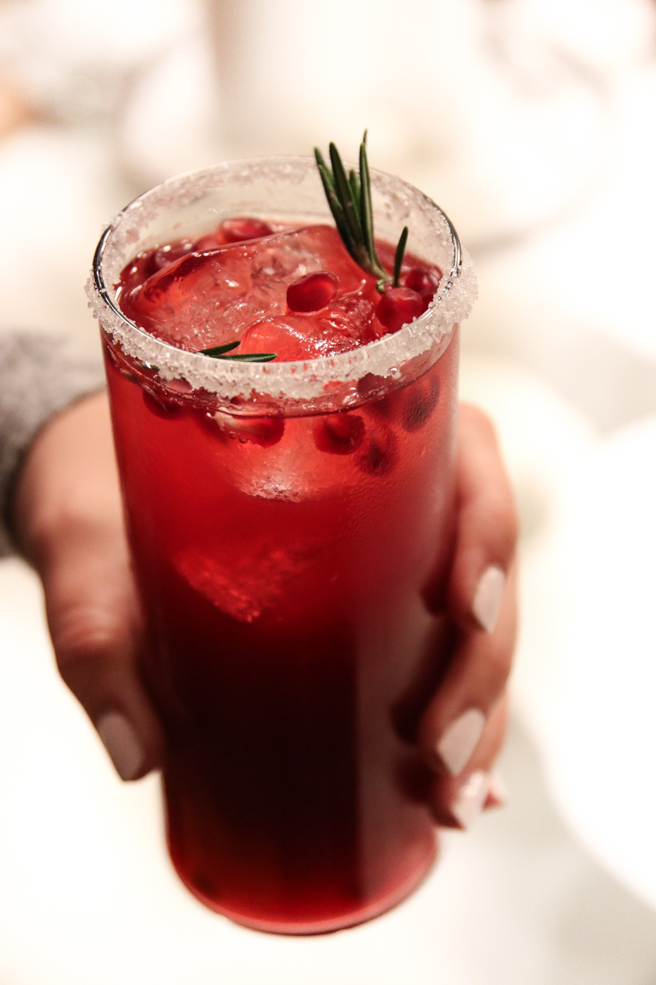 I put the roomie in charge of cocktails, but (obviously) had a very specific vision. I wanted a sweeter pomegranate cocktail and a lowball gin-based cocktail—because I think gin tastes like Christmas trees and how festive is that?